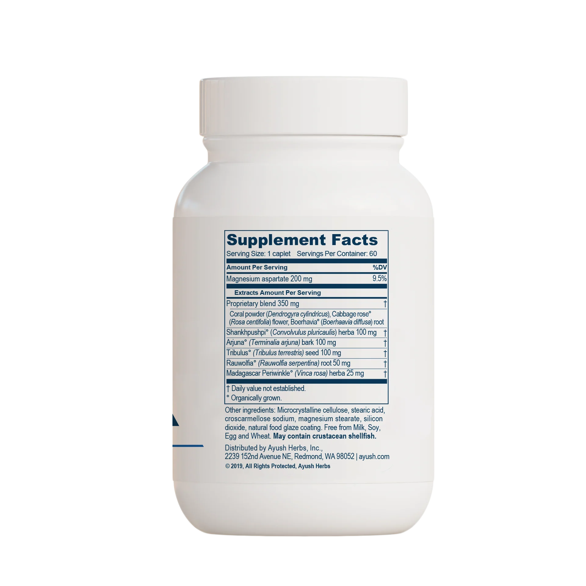 Ingredients: Magnesium aspartate ...200mg, Proprietary Blend ... 350mg (Rosa, Boerhaavia diffusa, Dendrogyra cylindricus), Convolvulus Pluricaulis ...100mg, Terminalia Arjuna ...100mg, Tribulus Terrestris ...100mg, Rauwolfia serpentine ...50mg, Vinca Rosa ...25mg, Stearic acid, Microcrystalline Cellulose, Croscarmellose Sodium, Magnesium stearate, silicon dioxide and Natural Food Glaze
