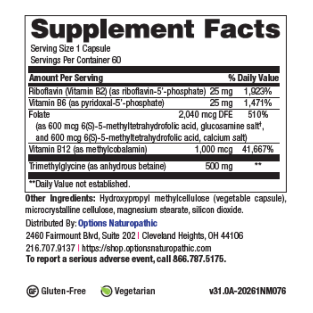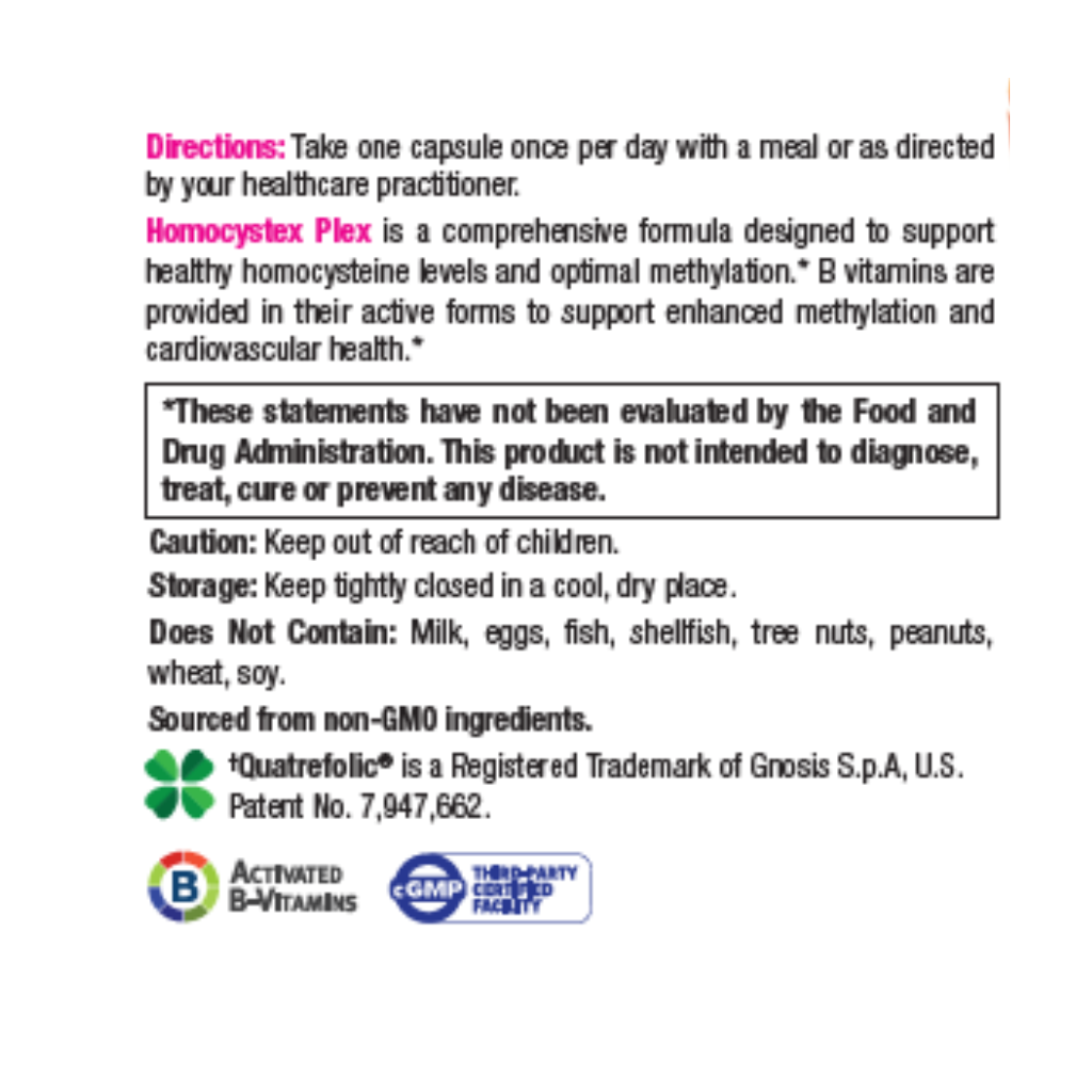 HomocystPlex is a comprehensive formula designed to support healthy homocysteine levels and optimal methylation. The 5-MTHF in this formula – Quatrefolic® – is the most biologically active form of folate, allowing rapid uptake into the bloodstream. The 5-MTHF in this formula is also known as the "L" form of 5-MTHF since it is the reduced form of folate. B vitamins are provided in their active forms to support enhanced methylation and cardiovascular health.*