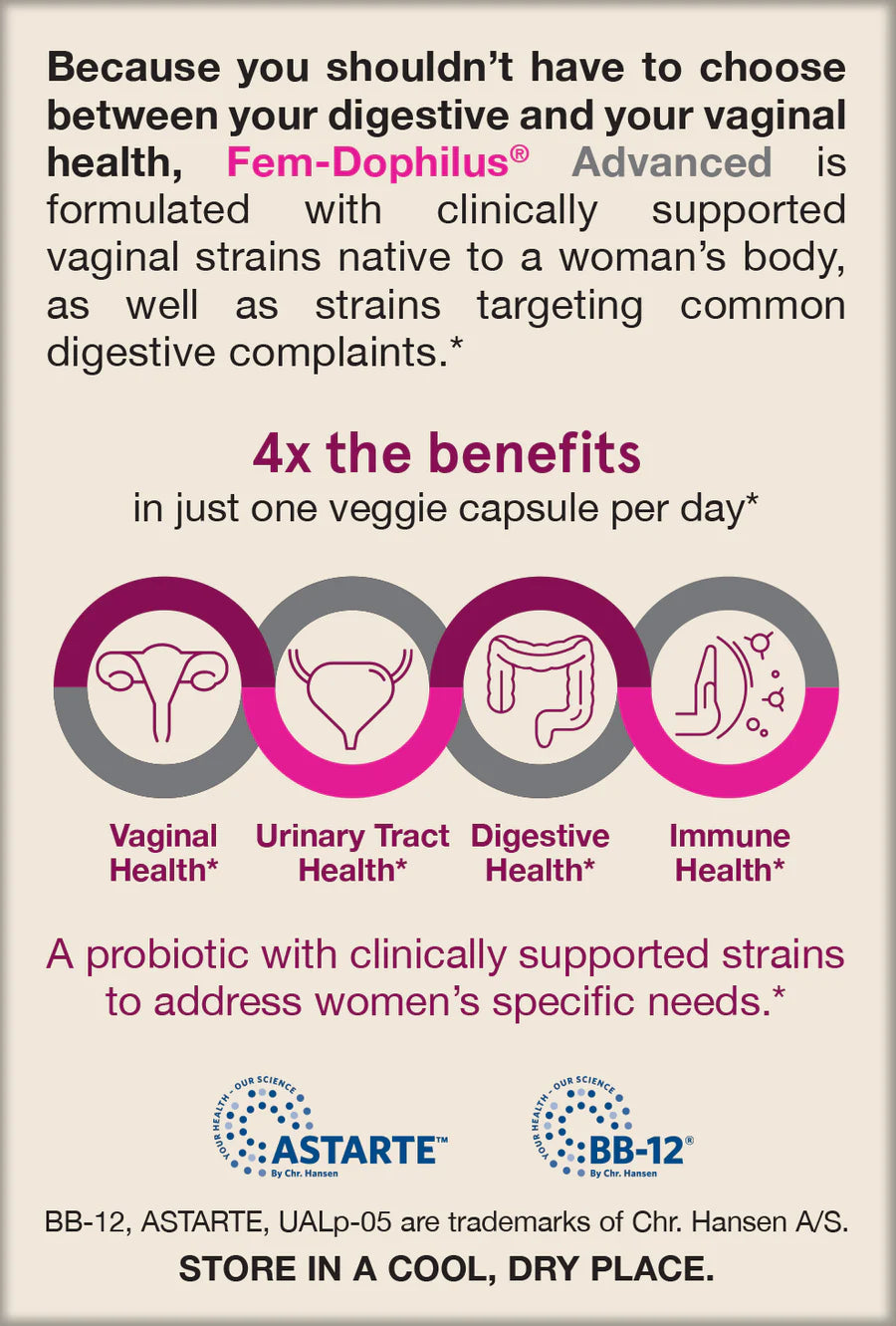 Fem-Dophilus® Advanced provides 4-in-1 daily care for women. It features four of the most prevalent vaginal Lactobacillus species that have been clinically shown to be effective to help restore healthy vaginal flora.* Combined with strains targeting common digestive complaints to deliver 4-in-1 benefits - helps to support vaginal, urinary tract, digestive and immune health in just one veggie capsule per day.
