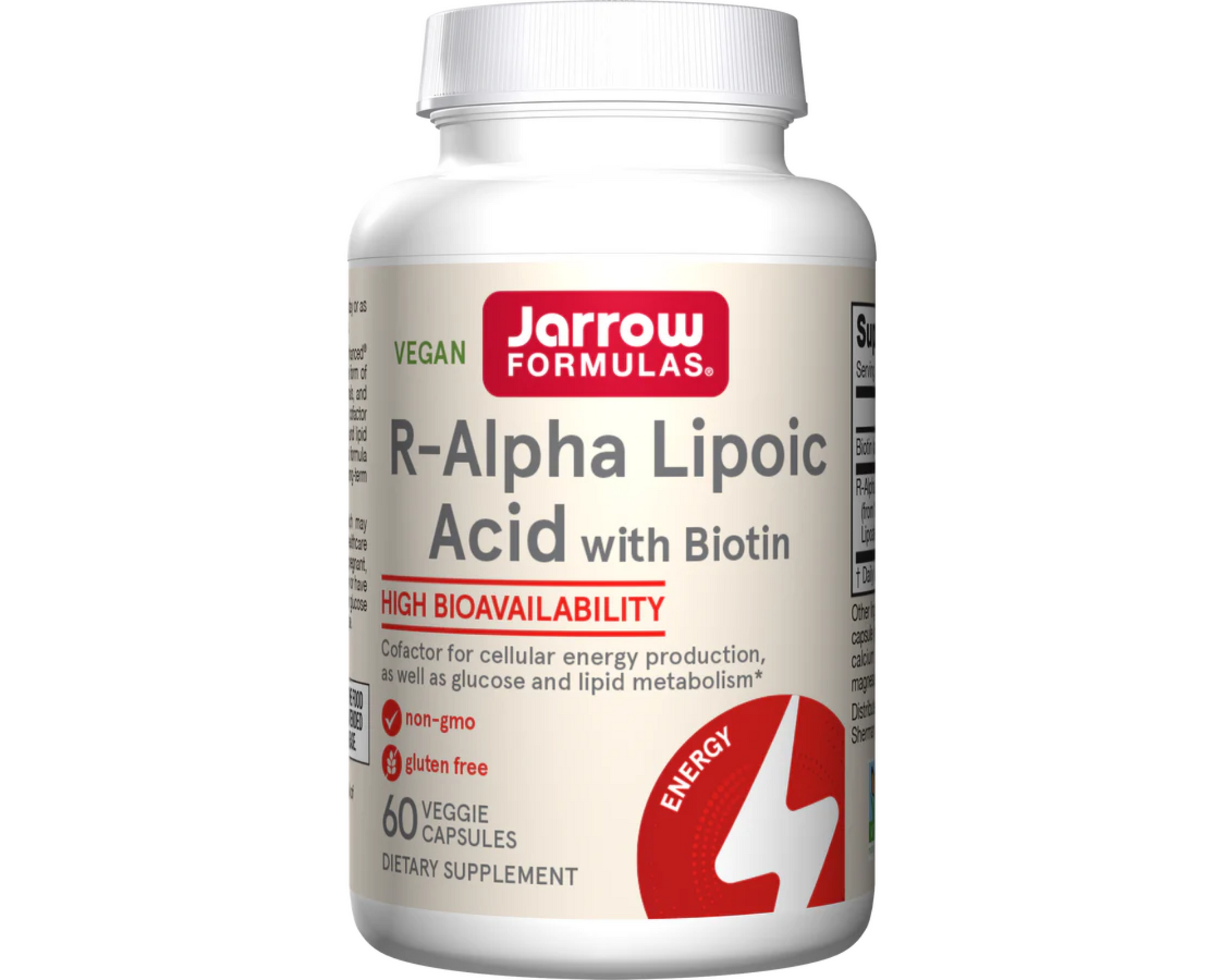 Jarrow Formulas® Stabilized R-Alpha Lipoic Acid (Bio-Enhanced® Na-RALA) is R-(+)-Alpha Lipoic Acid (RALA). It is heat and shelf stable and exhibits high bioavailability. Most alpha-lipoic acid supplements are racemic (i.e., they include equal amounts of the [(R)] and [(S)] forms). However, only RALA is the form found naturally in the body. RALA is a unique cofactor in energy production and helps regulate glucose and lipid metabolism.* RALA promotes the synthesis of glutathione and the induction of Phase II detoxification enzymes.* d-Biotin is a natural cofactor and may complement RALA in promoting mitochondrial health.